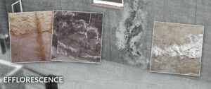 Efflorescence is a white chalky substance that can sometimes be seen on walls, and may look like little whiskers. It is actually salt deposits, which are dissolved and carried by water, and then left on the concrete or brick when the water dissolves. The salts usually come from within the building materials themselves, such as the calcium from concrete.